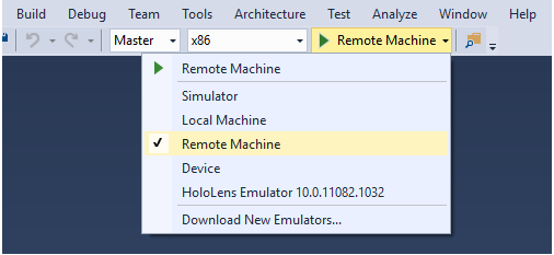 2.建議使用USB部署到HoloLens設(shè)備中,將運行目標設(shè)備制定為Device來部署的設(shè)備中。如果選擇部署到模擬器中,請選擇Simulator選項。到此您的第一個應(yīng)用基本創(chuàng)建完成,現(xiàn)在可以在HoloLens觀測一下這個物體在真實環(huán)境中的狀態(tài)。